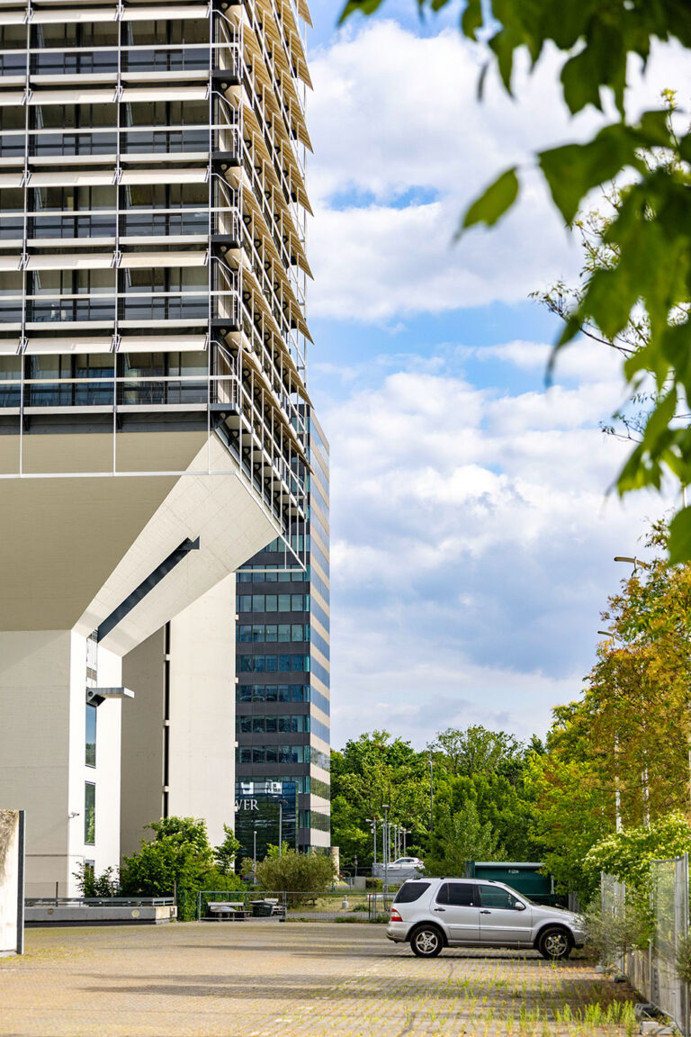 Wenn man – wie wir gestern – an einem Samstag das Areal besucht, kommt man sich ein wenig vor wie in einer Geisterstadt. Rund herum sind im Wesentlichen nur Bürogebäude und nur sehr spärlich sind Menschen und Fahrzeuge unterwegs. Auf den vielen Parkplätzen rund um die Olivetti-Türme parken nur vereinzelt Fahrzeuge. Heute ist dort unter anderem das koreanische Generalkonsulat untergebracht.