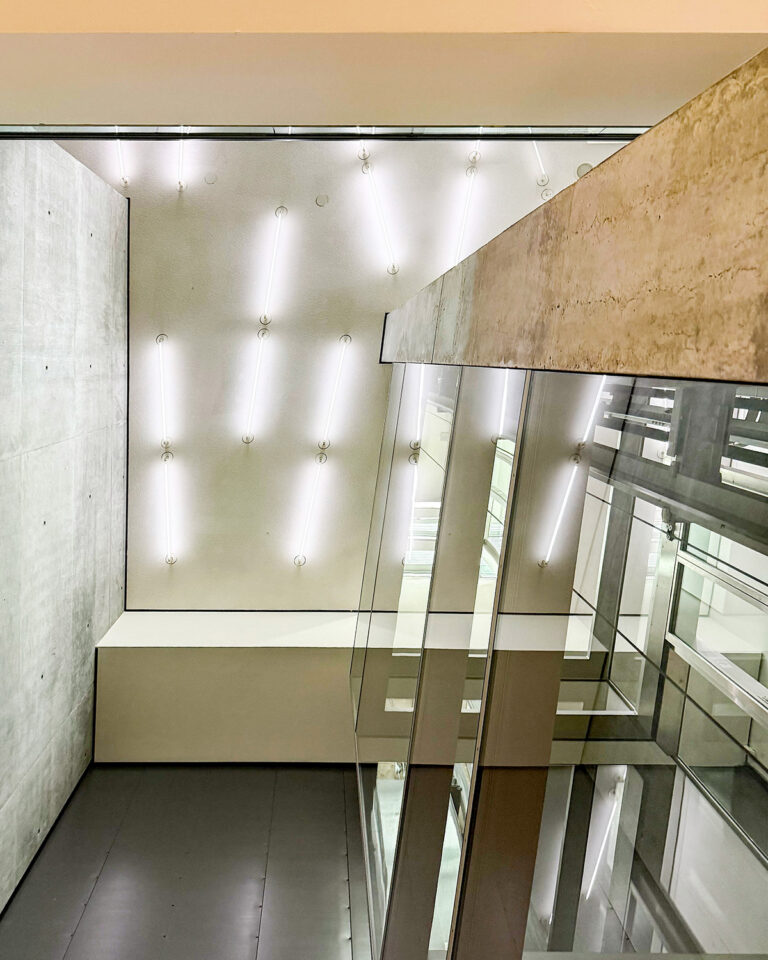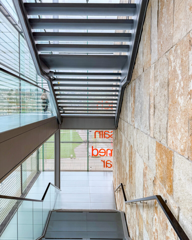 Auch und gerade die Architektur des Gebäudes, das äußerlich ein Glaswürfel ist, ist imposant – mit vielen Treppen und Übergängen.